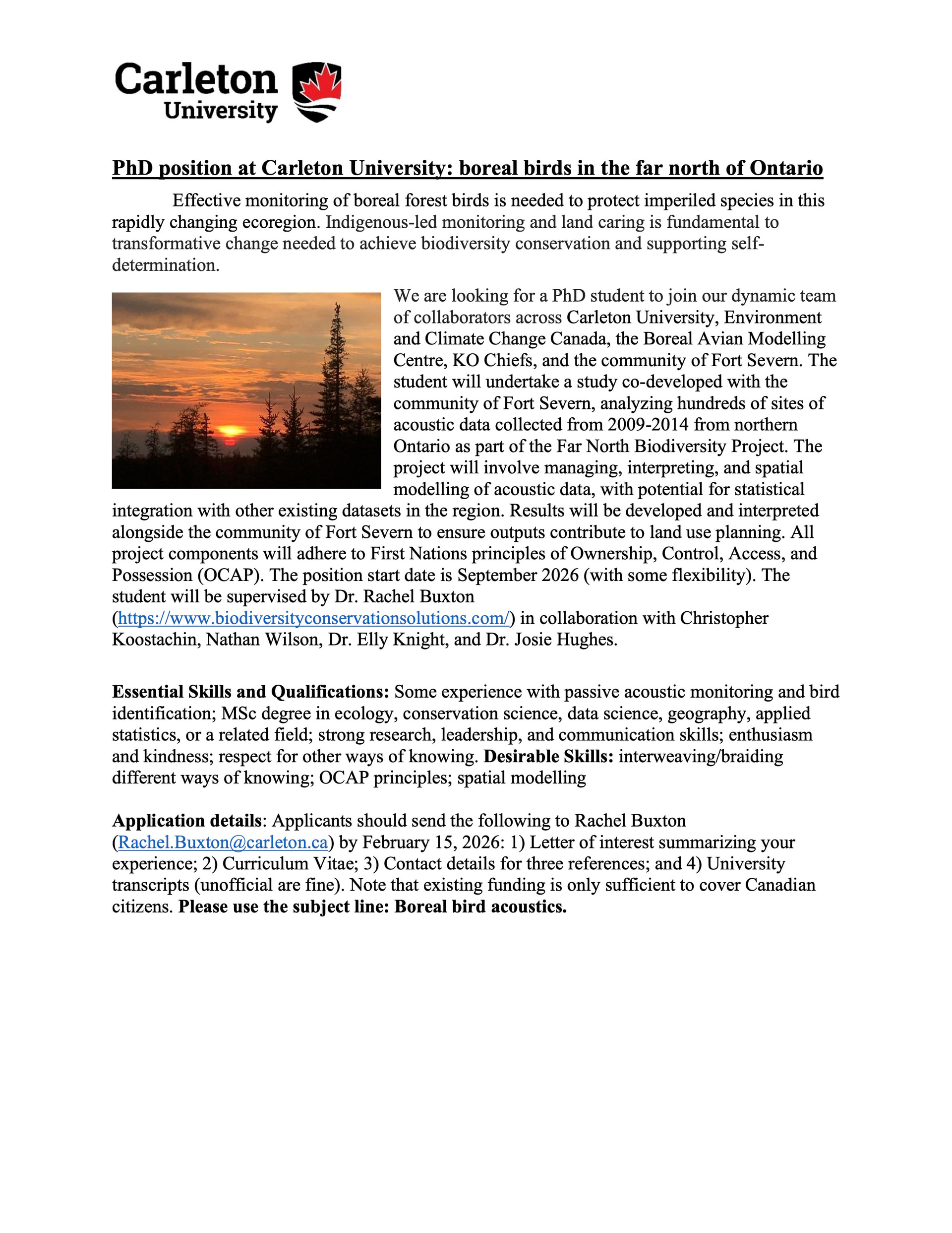 We are looking for a PhD student to join our dynamic team of collaborators across Carleton University, Environment and Climate Change Canada, the Boreal Avian Modelling Centre, KO Chiefs, and the community of Fort Severn. Please see the attached description!